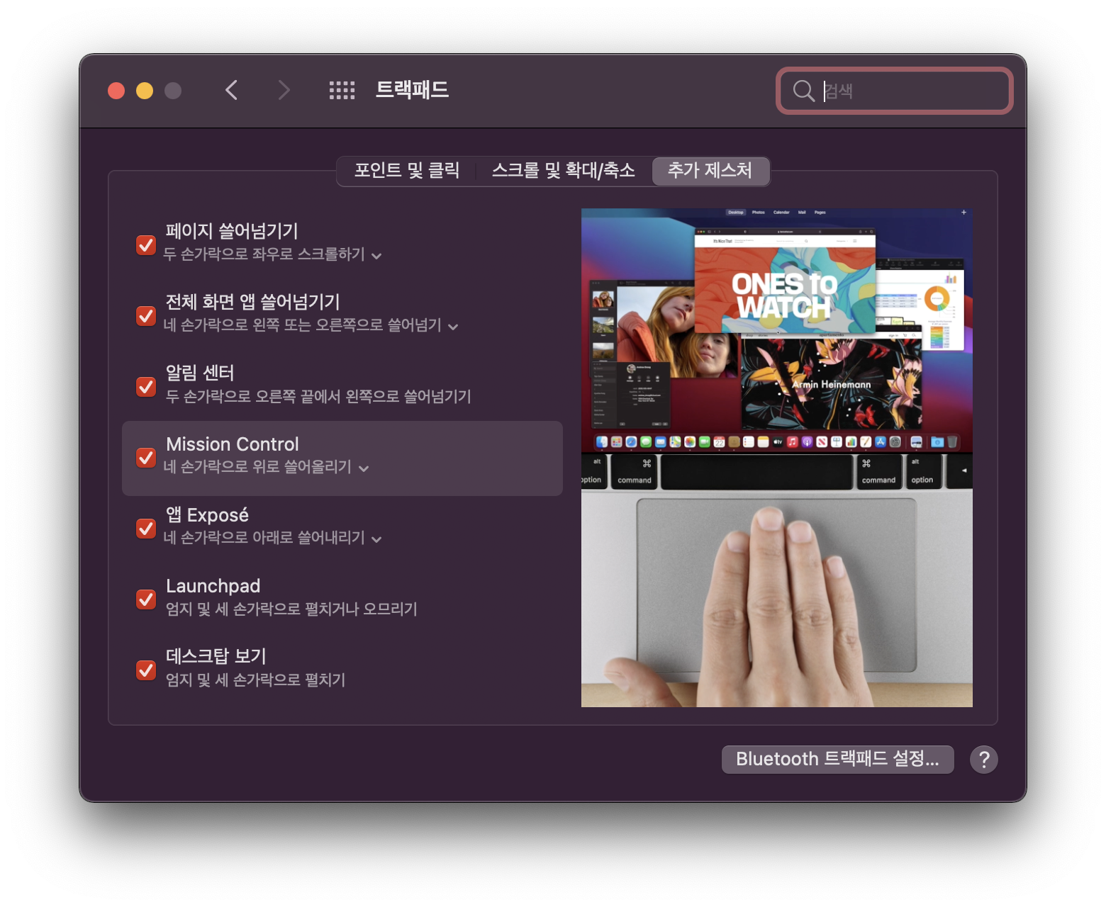 설정 > 트랙패드로 들어가면 맥북에서 트랙패드로 얼마나 다양한 제스쳐가 가능한지 볼 수 있다. 나는 개인적으로 포인트 및 클릭, 스크롤 및 확대/축소, 추가 제스처 모든 탭의 설정을 켜주고 '세 손가락으로 쓸어올리기' 같은 설정은 '네 손가락'으로 바꿔준다. 왜냐면 그래야 다음 개꿀설정을 쓸 수 있기 때문이다.