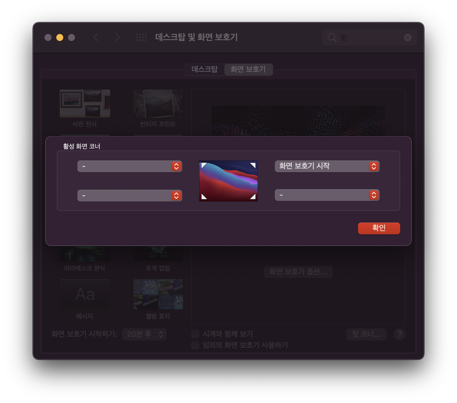 데스크탑 및 화면 보호기 > 화면 보호기 탭에서 아름다운 화면 보호기 중 일단 맘에 드는 하나를 선택하고 우측 하단 '핫 코너...' 설정에 들어가자. 그러면 각 화면 코너에 커서를 쭉 밀어 넣었을 때, 몇 가지 기능 중 선택해서 작동시킬 수 있는 매우 '핫'한 설정이다. 나는 우측 상단에 화면 보호기만 넣어두고 짧은 시간 자리를 비울 때 사용한다.