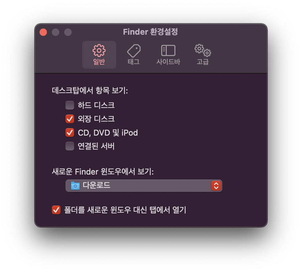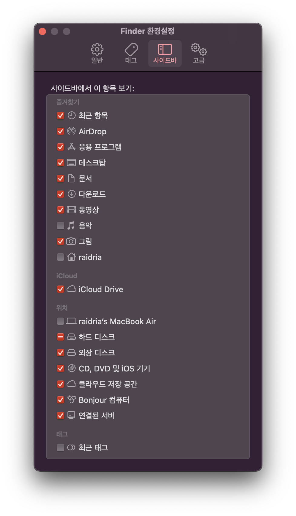 곧바로 파인더 환경설정 사이드바 탭에서 사이드바에 표시할 폴더들을 설정해준다. 저기에 없는 특정 폴더가 사이드바에 있길 원한다면 단순히 그 폴더를 사이드바에 드래그 해주면 된다.