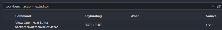 2. 'workbench.action.nextEditor' 검색 후 Keybinding 부부분을 더블클릭, 원하는 숏컷 입력.